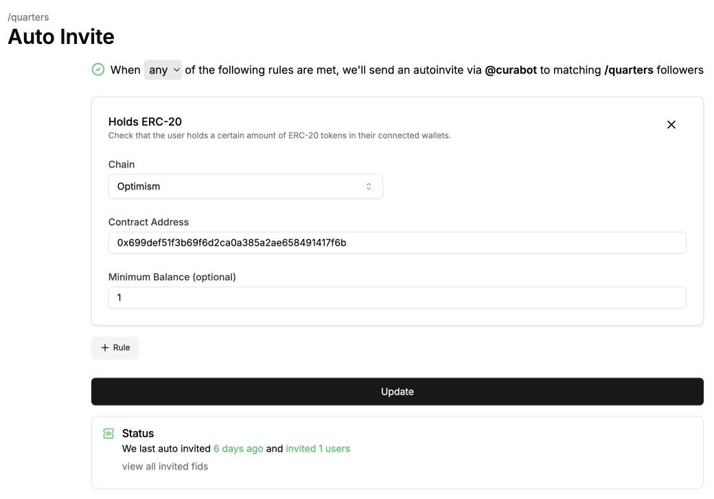 Use the Farcaster account that owns the channel to connect with Cura. Choose the channel you wish to add Auto Invite.